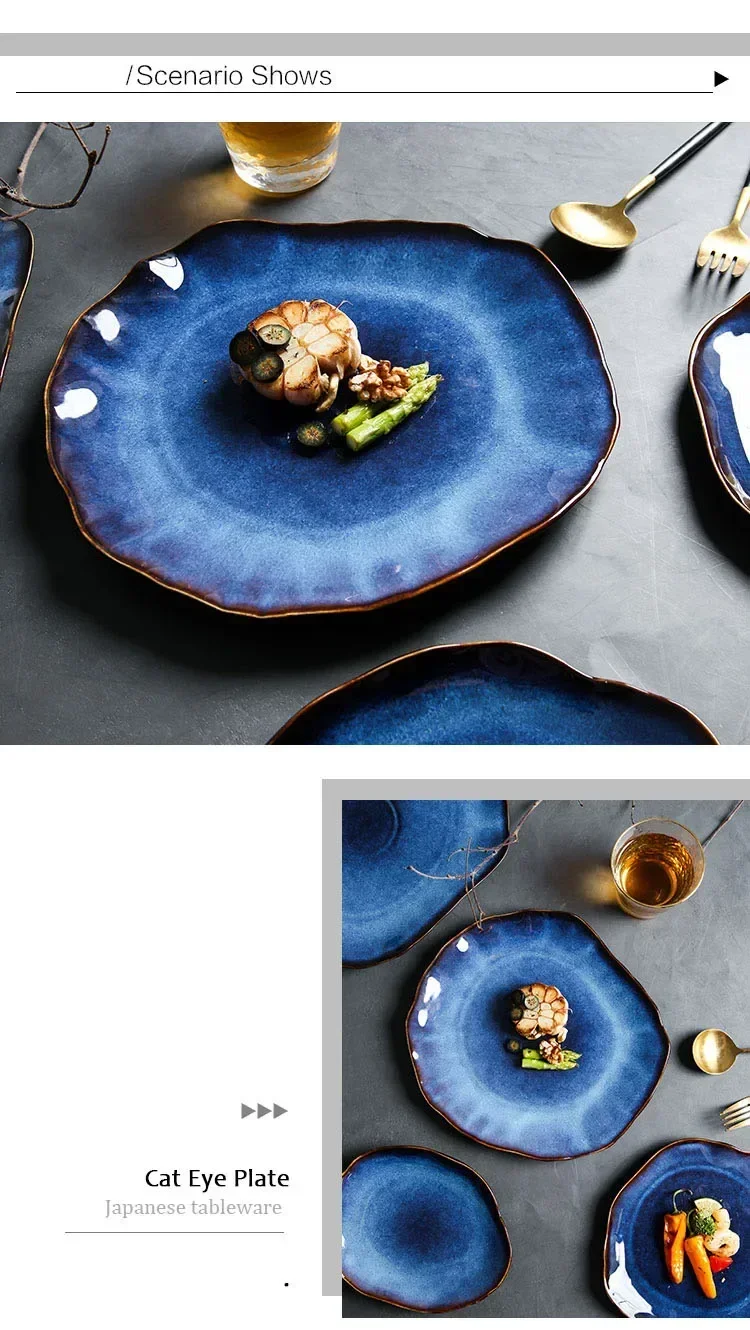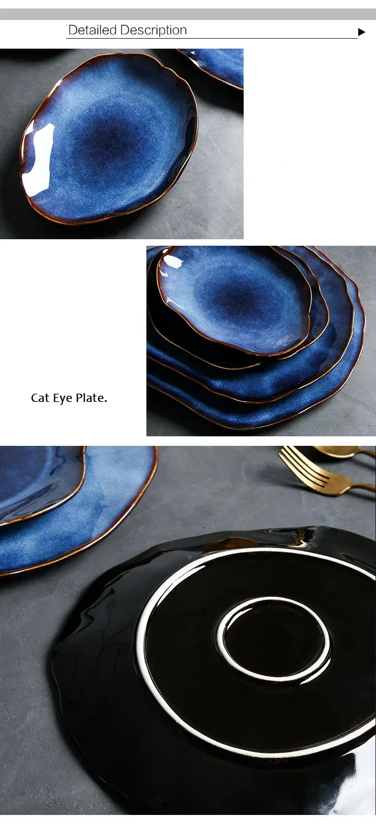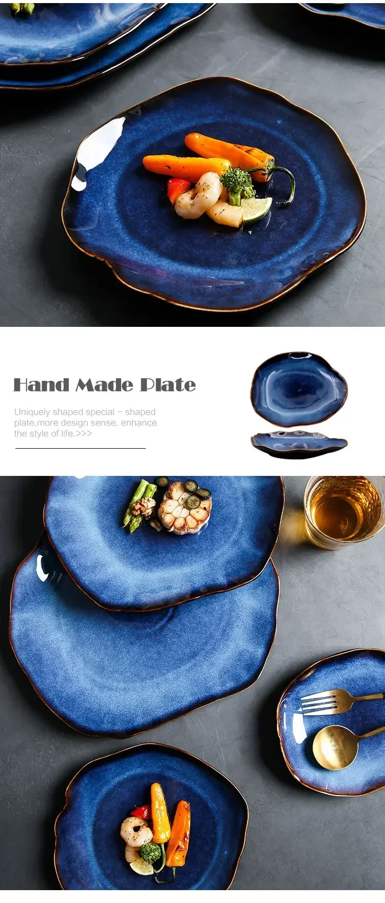 Ceramic Plates Deep Blue Irregular Flat Plate Pottery Dish Household Decoration Tableware Dinnerware Tray Hotel Kitchen Supplies